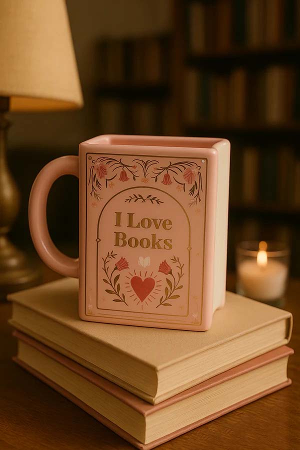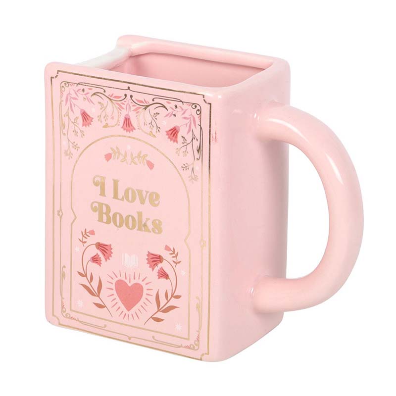 💖 Miluji knihy – růžový hrnek ve tvaru knihy