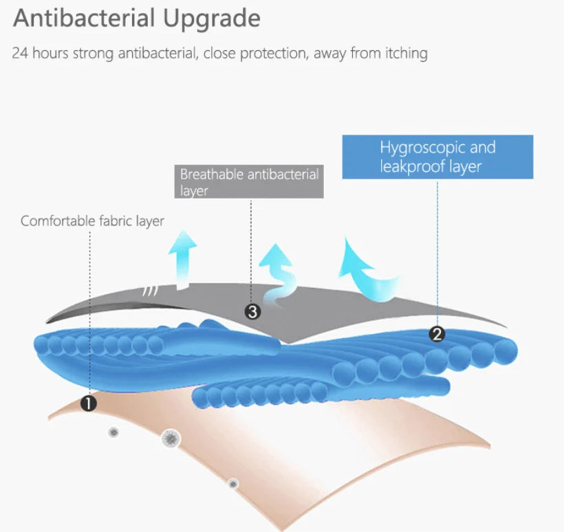 2023 Nejnovější vývoj nepropustných materiálů, rychle absorbuje 30 ml tekutiny a uzamkne ji, což odpovídá 4-5 standardním tamponům nebo vložkám. A udržuje vaše kalhotky suché po celý den!